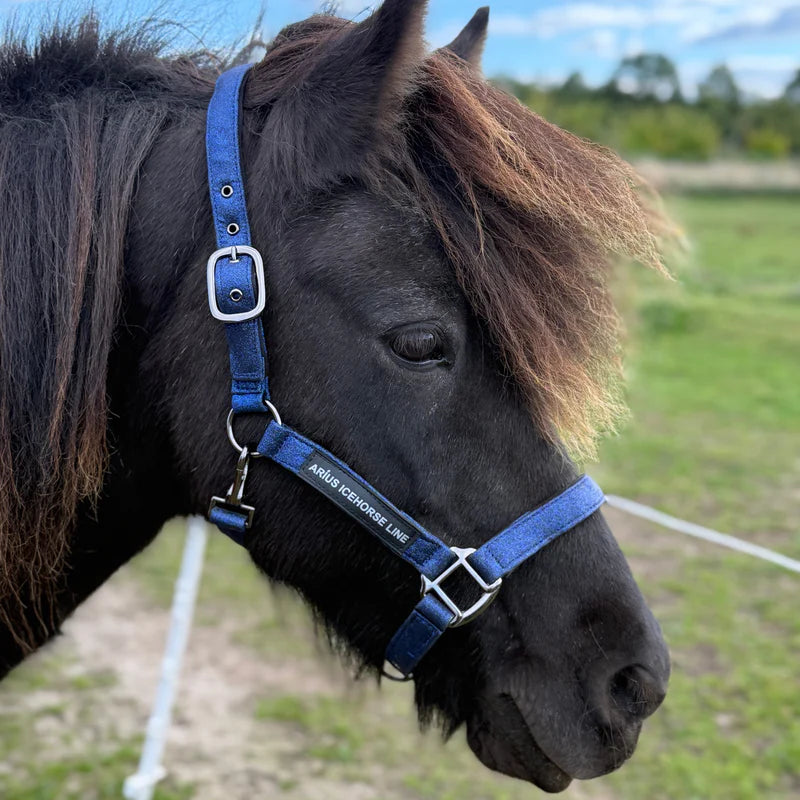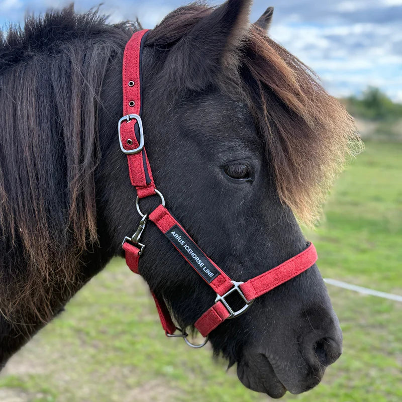 Grimen har et flot silikone badge på kindstykket med sølvskrift "Aríus icehorse line". Grimen har sorte spænder. Findes i mange farver.