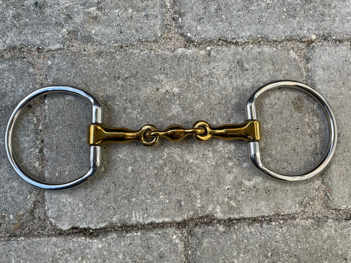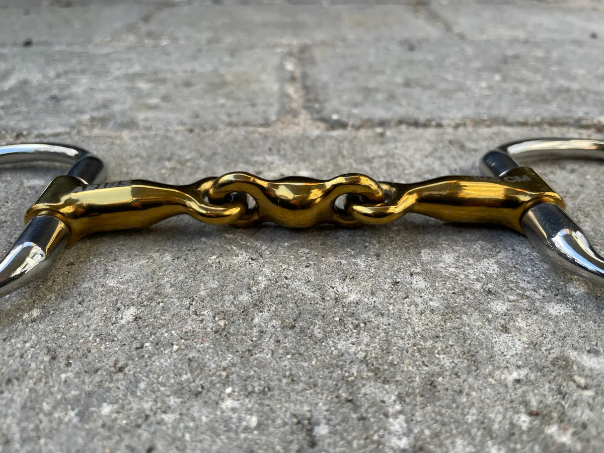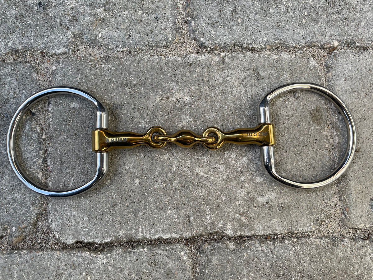 3 delt bid fra Aríus med muffe-sider og anatomisk udformning - let buet for at gøre biddet så behageligt for hesten som muligt. Ultra let bid, da det er fremstillet i titanium, der er et letvægtsmateriale. Hjælper rytteren til at have en let og levende kontakt til hesten, men samtidig god støtte i siderne ved hjælp af muffe-ringene.