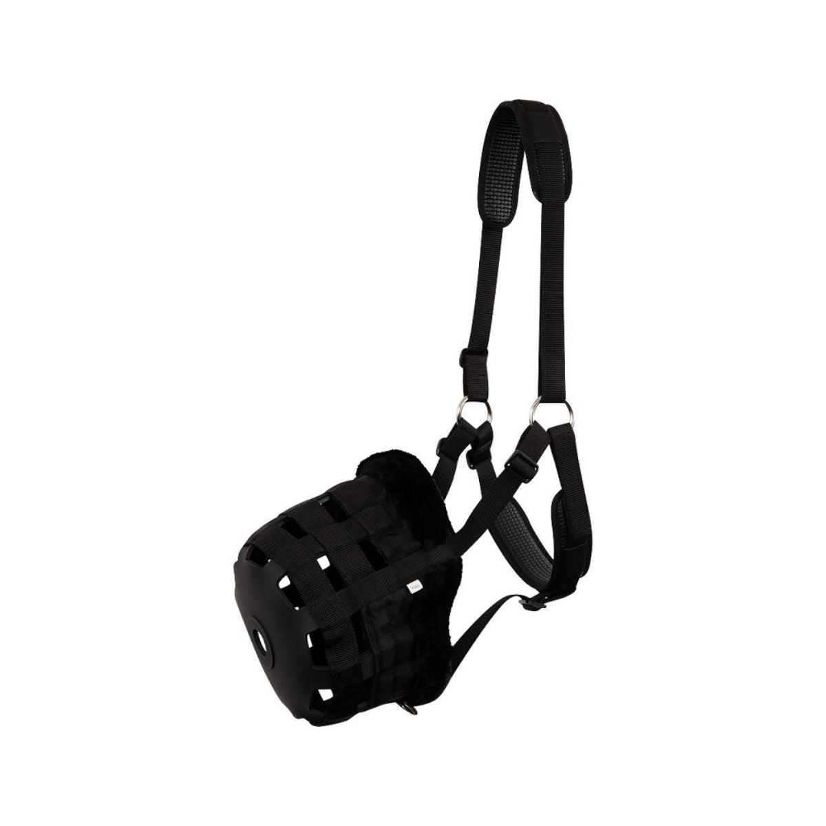 Denne solide græsningsmule er udstyret med en base af TPU og stropper i polyester. Munden er foret med kunstpels på og omkring næsen for ekstra komfort. Nakkestykket og halsremmen er lavet af et blødt syntetisk materiale.