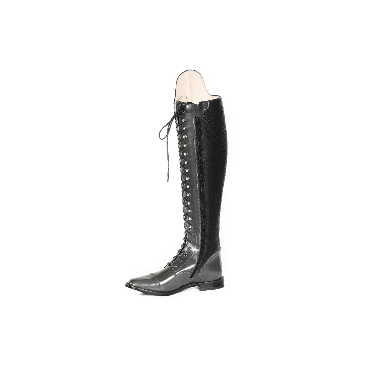 Det er en smart dressurstøvle lavet af fransk kalvelæder med meget høj dressurbue og snører i front. Støvlen har lynlås på bagsiden.