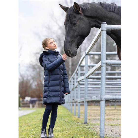 Covalliero frakken til børn imponerer med sin generøse polstring, som sikrer optimal varme og komfort. Den praktiske hætte beskytter mod vind og vejr, mens rideslidsen er udstyret med knapper for at sikre maksimal bevægelsesfrihed i sadlen.