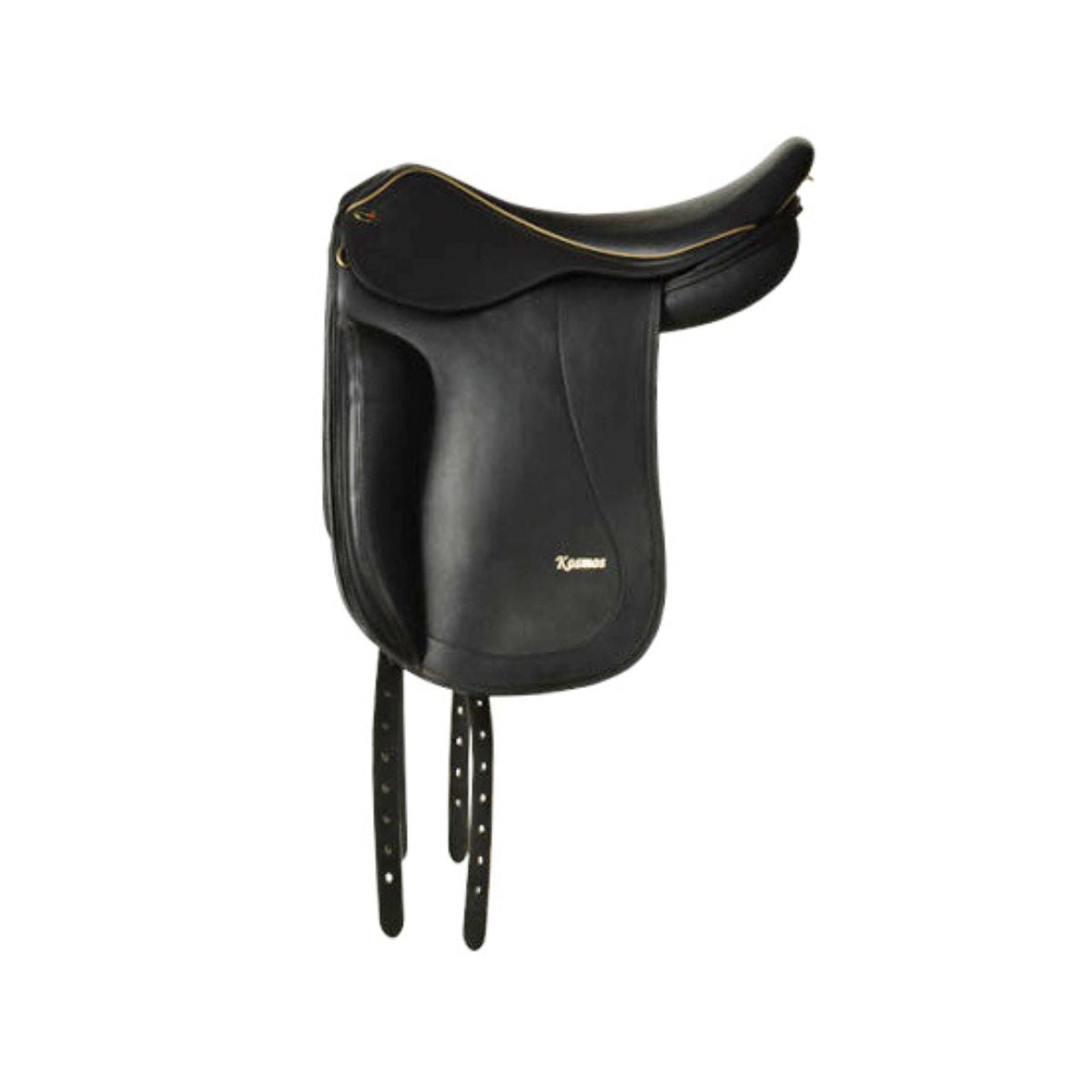 Eques Kosmos sadel. Sadlen er bygget som en enkeltlags sadel, hvilket gør, at man får en tættere kontakt med hesten. Det er en kort sadel, der findes i hhv. 16, 17 og 18 tommer, med flexi-bom og med udskiftiligt kopf-jern i tre størrelser.