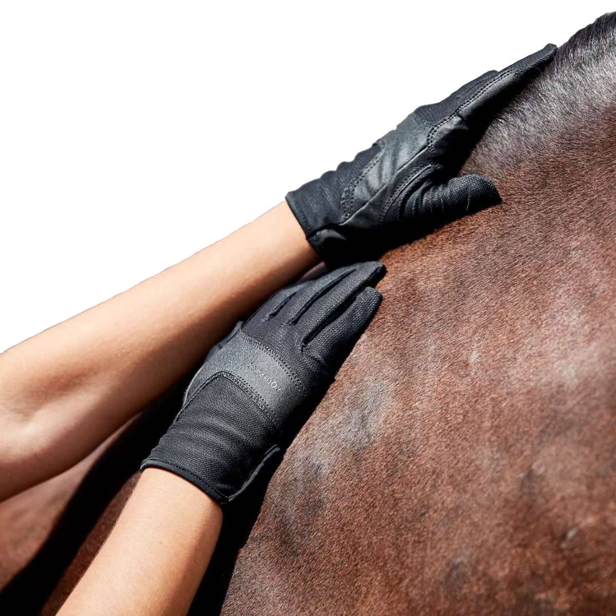 Ridehandsker med mesh fra Equipage. Handskerne har grib på indersiden af hånden for et godt greb i tøjlen og mesh på oversiden af hånden. Det gør dem mere åndbare og behagelige på varmere dage. Med touch-funktion så du kan bruge en touchskærm uden at skulle tage handskerne af.