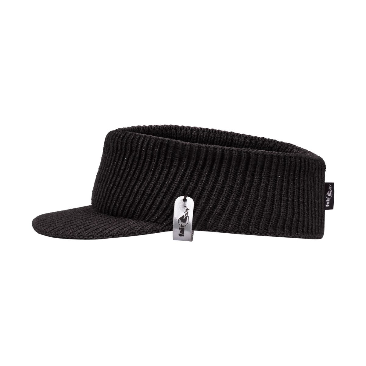 Pandebånd med skygge fra Fair Play. Ribstrikket pandebånd med skygge. Sort med en smule glimmer i garnet. God til dig der ikke synes et almindeligt pandebånd ser godt ud eller når huen er for varm. One-size.