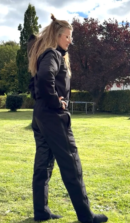 Lynlåsene er overlagte, så man opnår optimal beskyttelse mod regn. Derudover har dragten også et justerbart elastisk bælte med klikspænde.