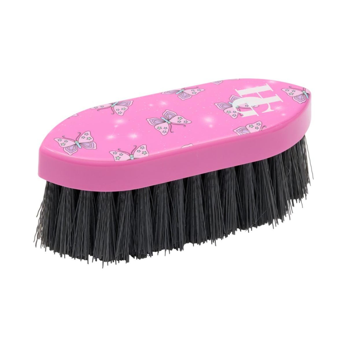Børste med sødt motiv. Strigle til hest og pony. Børsten har længere hår for hurtig og eftergivende strigling. God børste, der kan bruges til det hele og bør findes i enhver strigletaske. Pink med sommerfuglemotiv.
