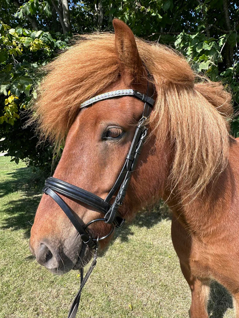 Flot pandebånd fra PH deluxe med 3 rækker glimtende rainbow sten. Passer både til alm smalt nakkestykke og til deluxe serien.