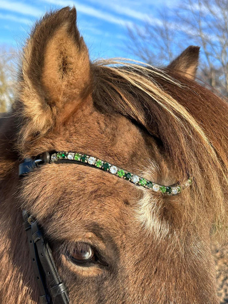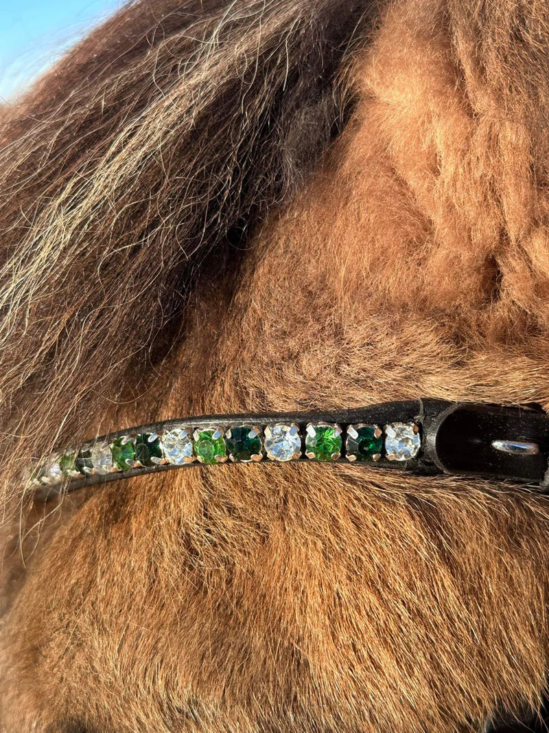 Flotte pandebånd med diamanter, skiftevis i grønne nuancer. Pandebåndet er smukt fint udkåret uden meget synligt læder omkring sten.
