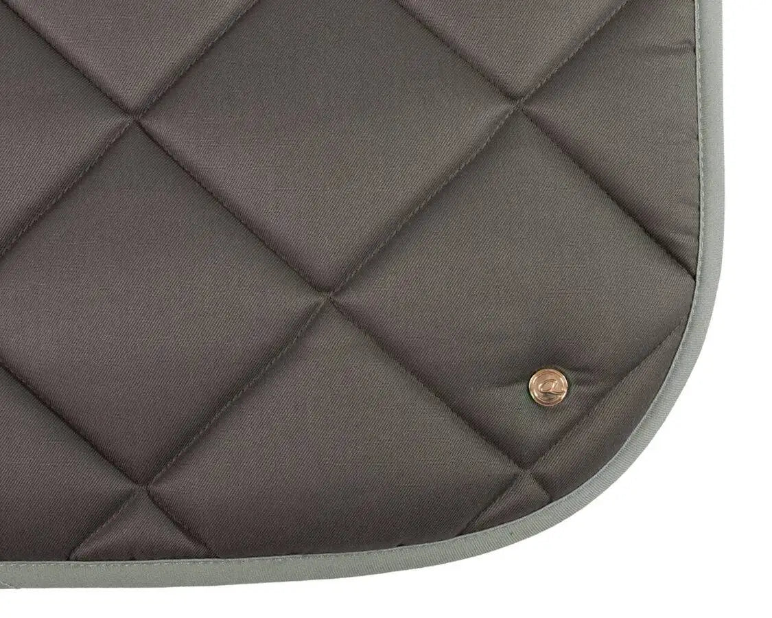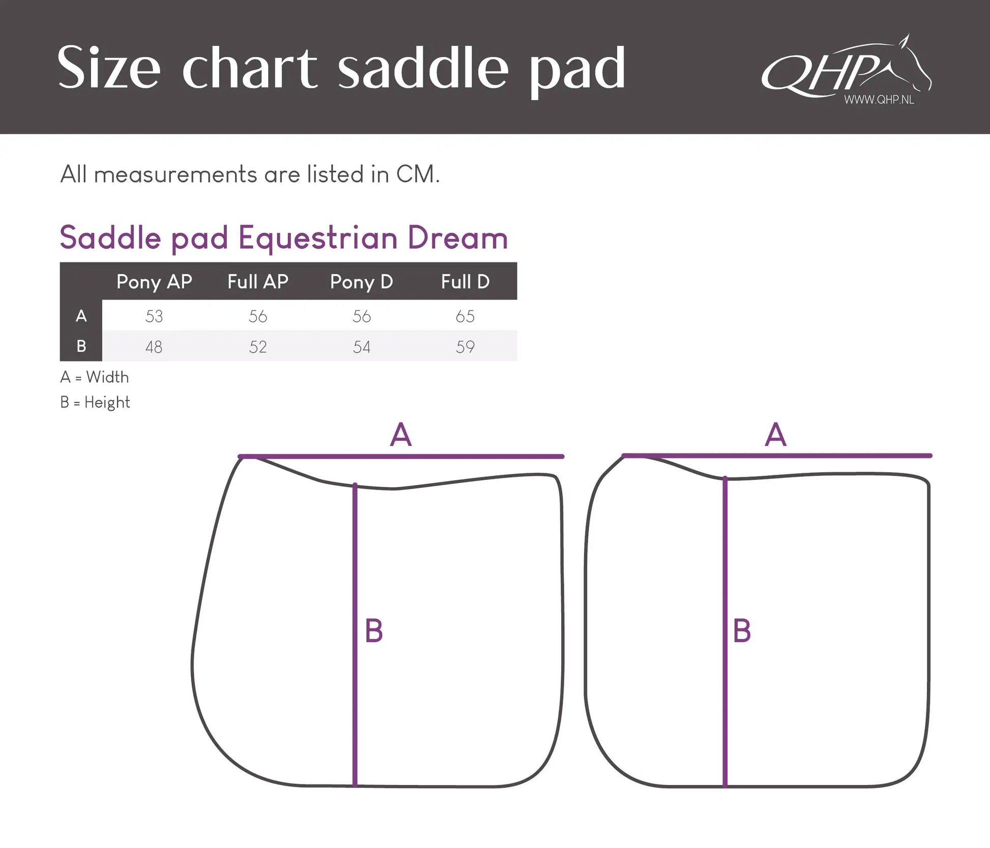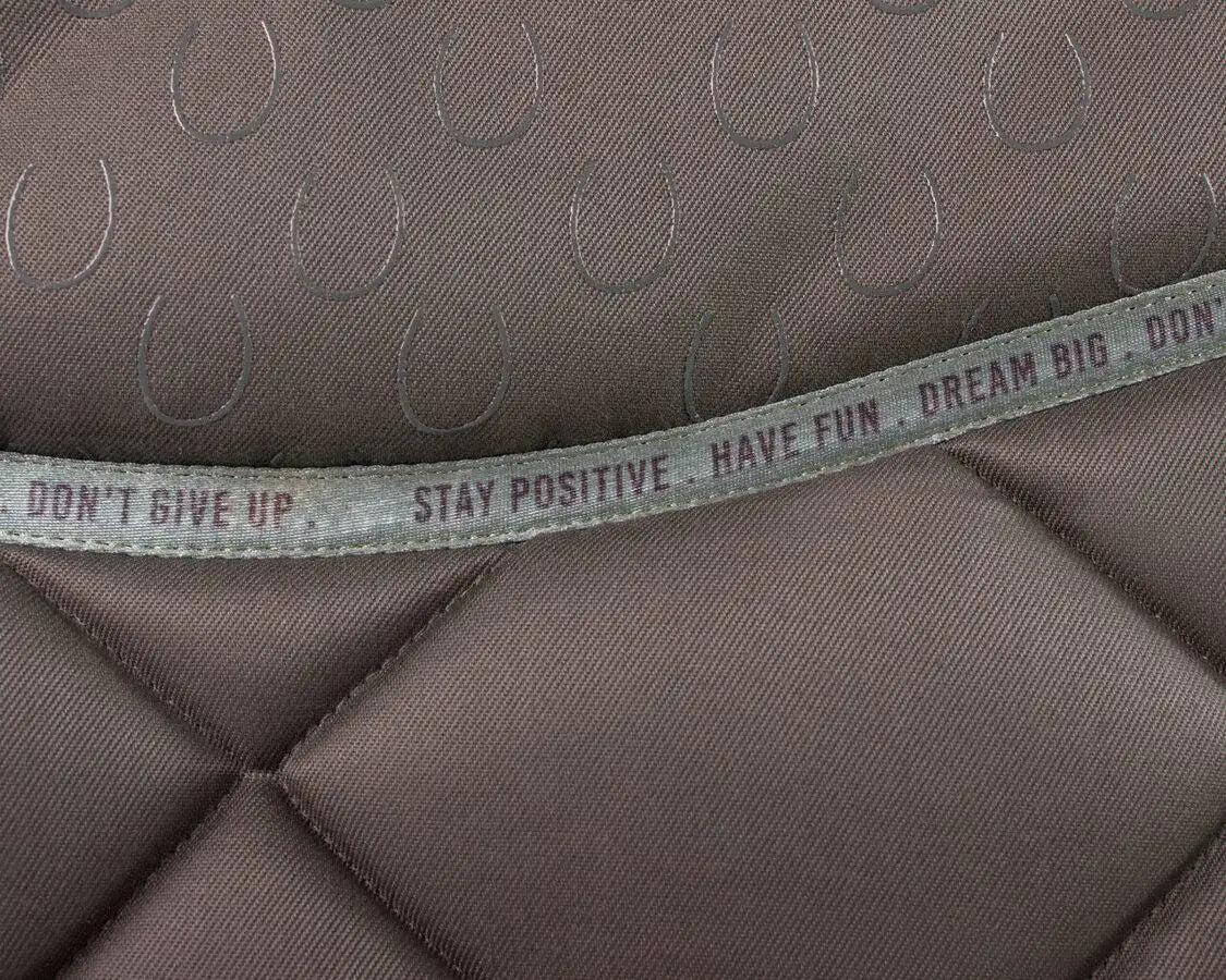 Det sporty sadelunderlag fra Equestrian Dream-serien kombinerer stil og funktionalitet. Den dekorative kant med teksten "Stay positive, have fun, dream big" giver et unikt touch, mens de integrerede hestesko på toppen sikrer et middelgreb, der holder underlaget stabilt under ridning.