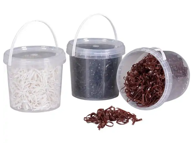 Gummielastikker til fletninger. Posen indeholder 50g, hvilket svarer til omkring 45 elastikker. Med den lille bøtte kommer ligeledes omkring 45 elastikker, og i den store, omkring 1500stk.
