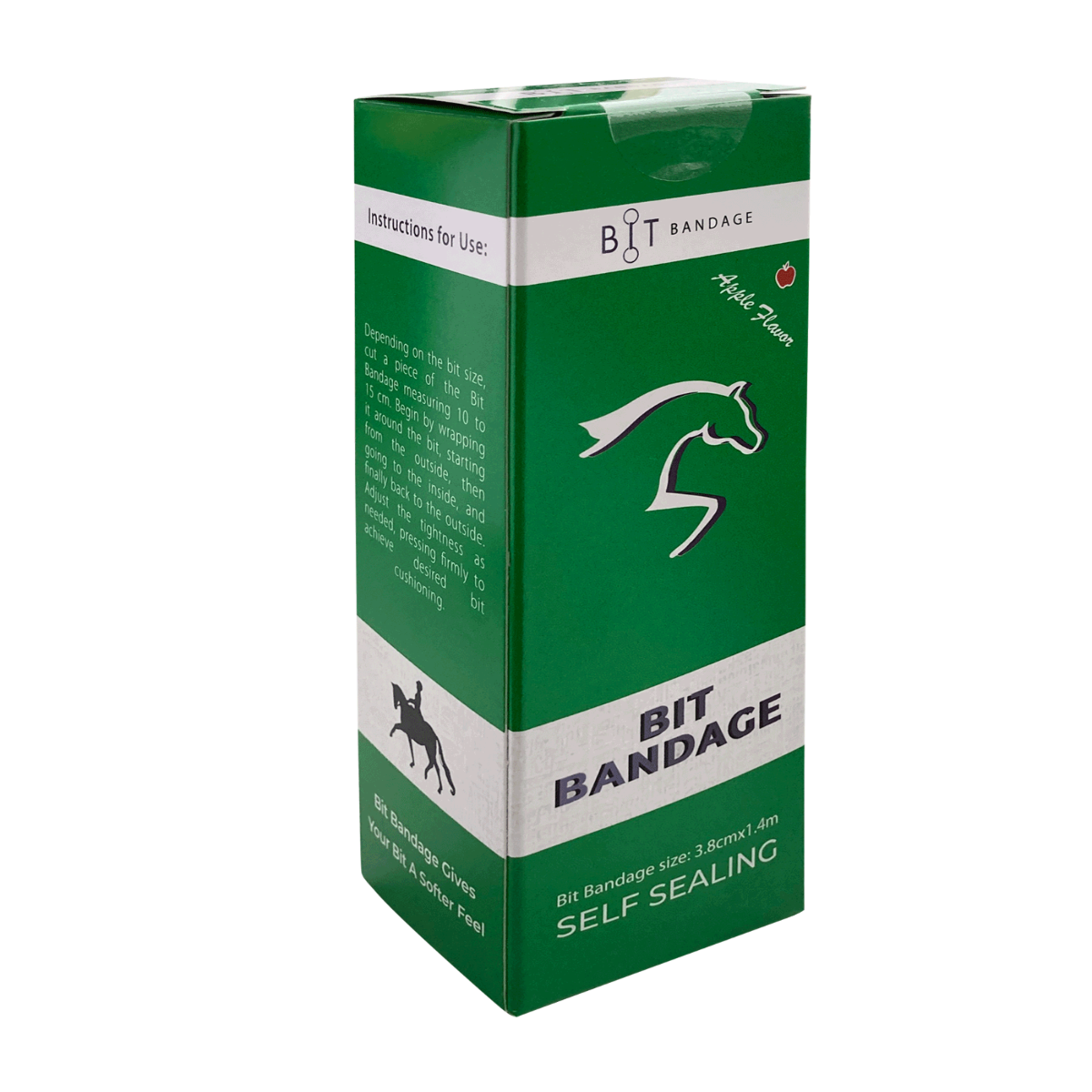 Selvklæbende, fleksibel bidbandage i blød skum. Ideel til at gøre mundstykket på bidet blødere. Kan bruges til ethvert bid. Afhængigt af størrelsen på bidet skæres et stykke på omkring 10-15 cm fra bandagen. Startende på ydersiden, vikles bandagen rundt om indersiden af bidet og derefter tilbage til ydersiden. Bandagen skal vikles så stramt som muligt. Hvis det er nødvendigt, kan et ekstra lag tilføjes for ekstra blødhed.