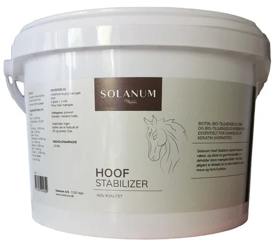 Solanum Hoof Stabilizer for god hovkvalitet. Styrker hovenes vækst og sikrer en god hornkvalitet. Det er især vigtigt ved skoning af hesten. Anbefalet daglig mængde er 6g. Maks. 10,5 g pr. kg af det daglige foder (inklusive stråfoder)Indeholder 500g. Indhold: